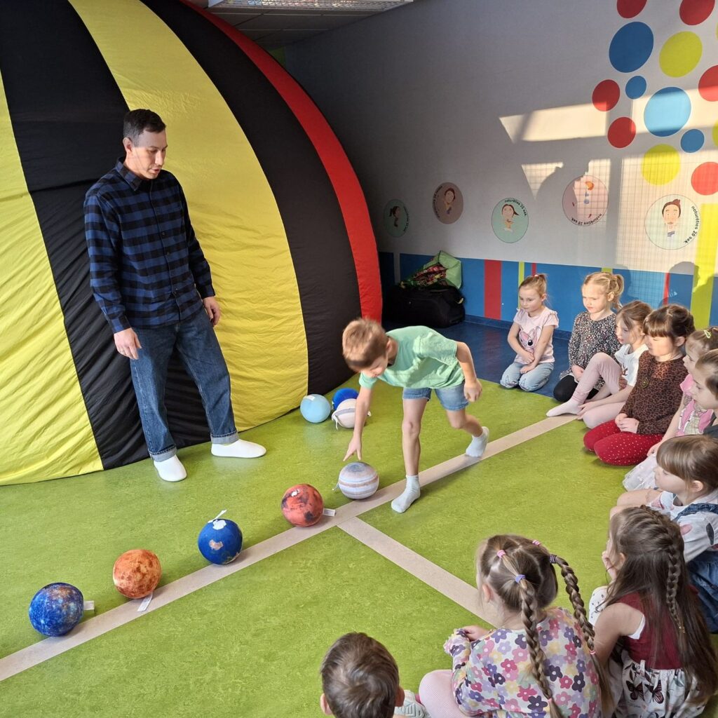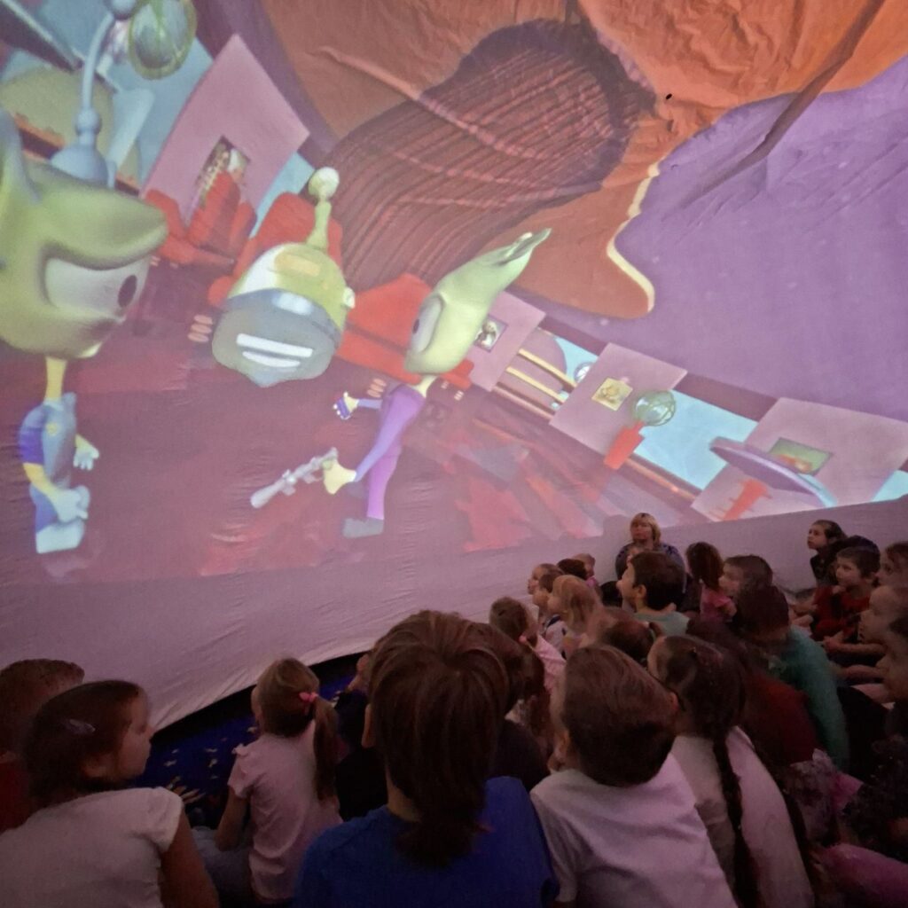 2026. gada 16. janvārī mūsu pirmsskolas izglītības iestādē ESF+ projekta “STEM un pilsoniskās līdzdalības norises plašākai izglītības pieredzei un karjeras izvēlei” ietvaros norisinājās aizraujoša un izzinoša aktivitāte – digitāls ceļojums apkārt Saules sistēmai. Nodarbība notika īpaši sagatavotā kupolā, kas radīja bērniem sajūtu, it kā viņi paši dotos kosmosa piedzīvojumā. Nodarbības laikā bērni skatījās krāsainu un bērniem saprotamu multfilmu par kosmosu, planētām un to kustību Saules sistēmā. Pēc multfilmas noskatīšanās bērniem bija iespēja iegūtās zināšanas nostiprināt praktiski – aktīvi darbojoties, viņi sarindoja planētas pareizā secībā, sākot no Saulei tuvākās.