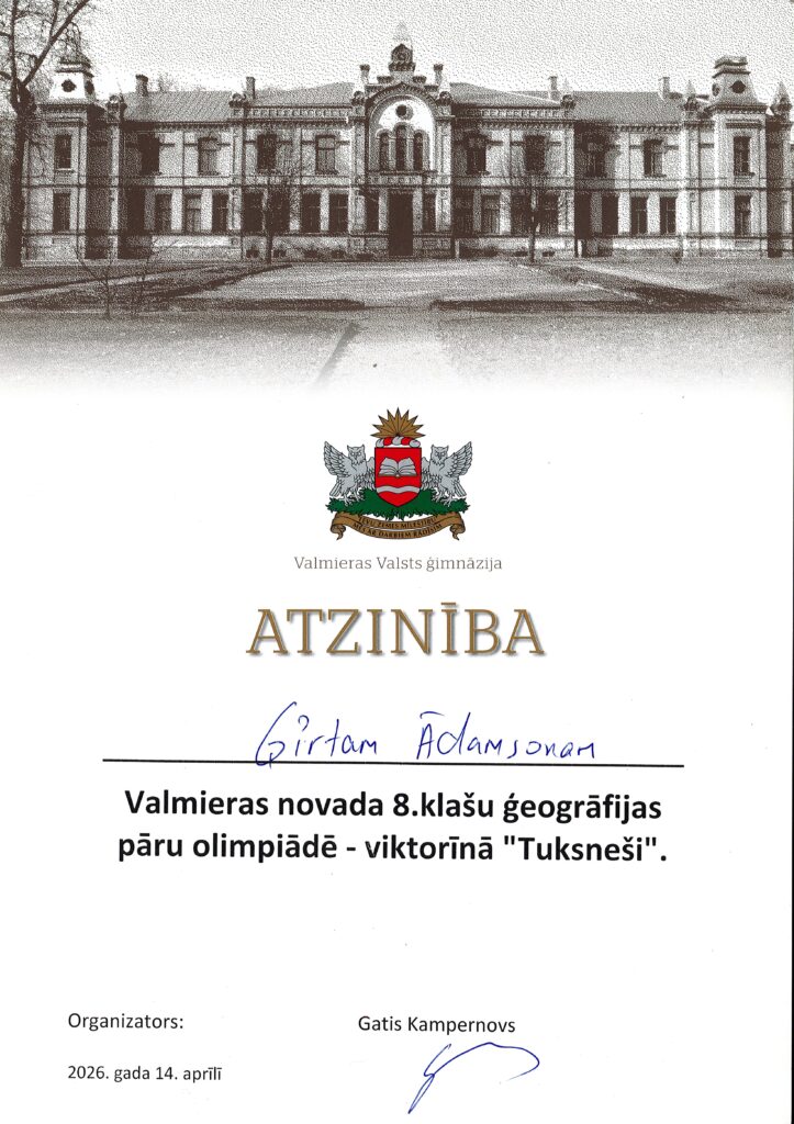 Sveicam Ģirtu Ādamsonu un Rūdolfu Bijonu ar iegūtu ATZINĪBU Valmieras novada 8.klašu ģeogrāfijas pāru olimpiādē-viktorīnā “Tuksneši”