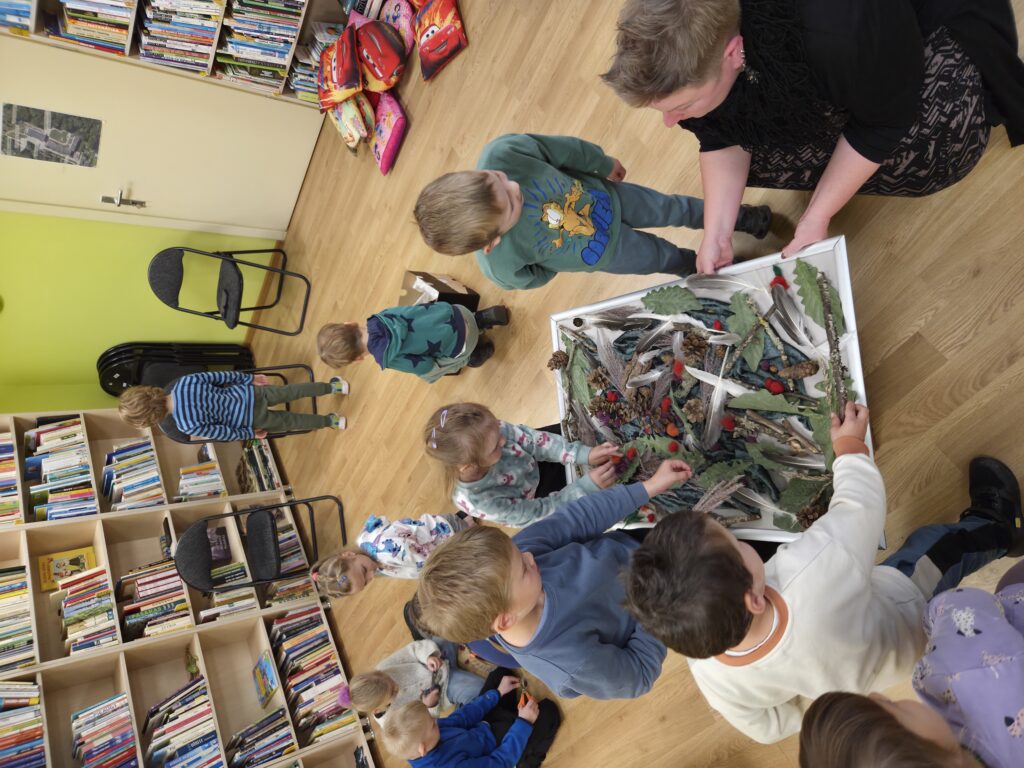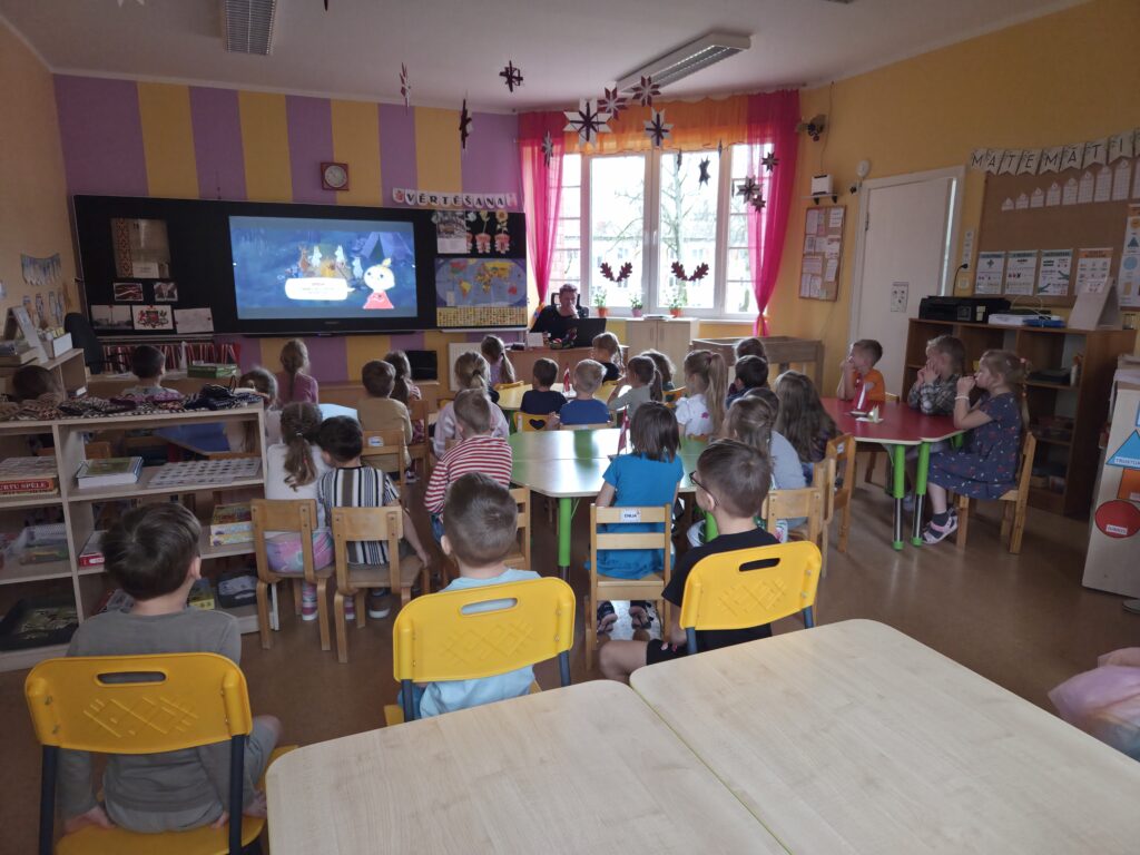 Šodien pie mums viesojās bibliotekāre Liene, kura iepazīstināja bērnus ar Ziemeļvalstīm, tās rakstniekiem un pasaku varoņiem. Bērni ar aizrautību klausījās Tūves Jānsones pasaku “Mumins un jaunais draugs”. Pēc pasakas izlasīšanās, skatījās īsu filmiņu par Muminu un viņa draugiem, pārrunāja, ko nozīmē vienotība.