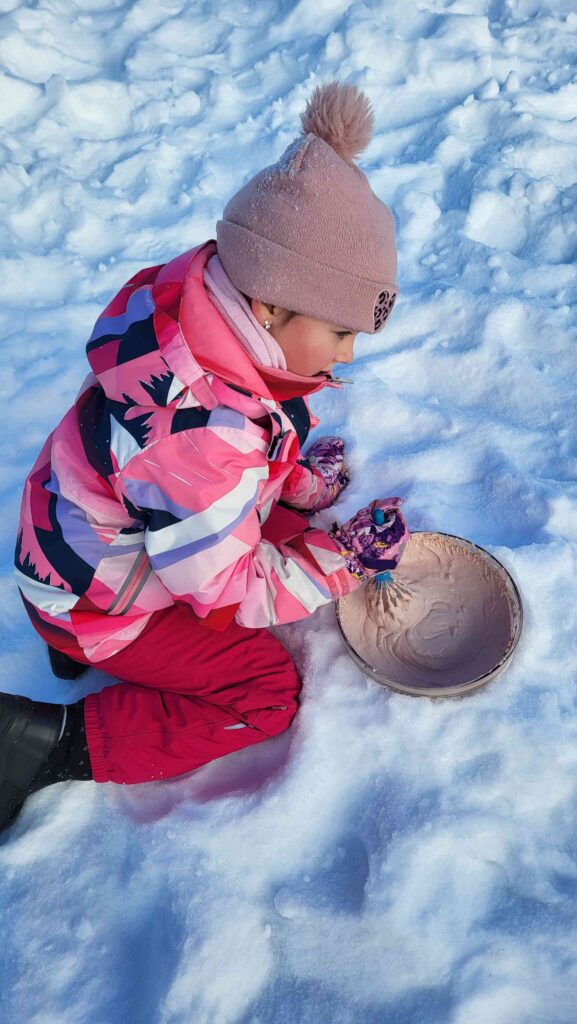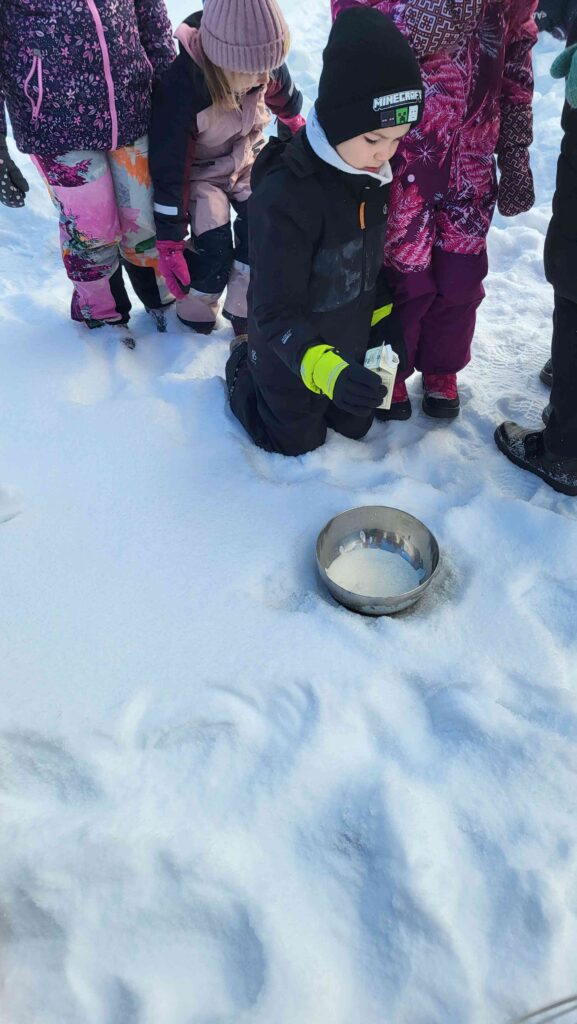 “Saldējumu gatavošana sniegā” – izrādās, ka saldējumu var pagatavot sniegā, un tas sanāk ļoti gards. Ir arī nepieciešama neliela pacietība un spēks, jo maisīt sanāk diezgan ilgi un daudz! Saldējumu gatavojām divos traukos – stikla un metāla. Pārsteigums bija liels, ka stikla traukā saldējums pagatavojās ātrāk.
