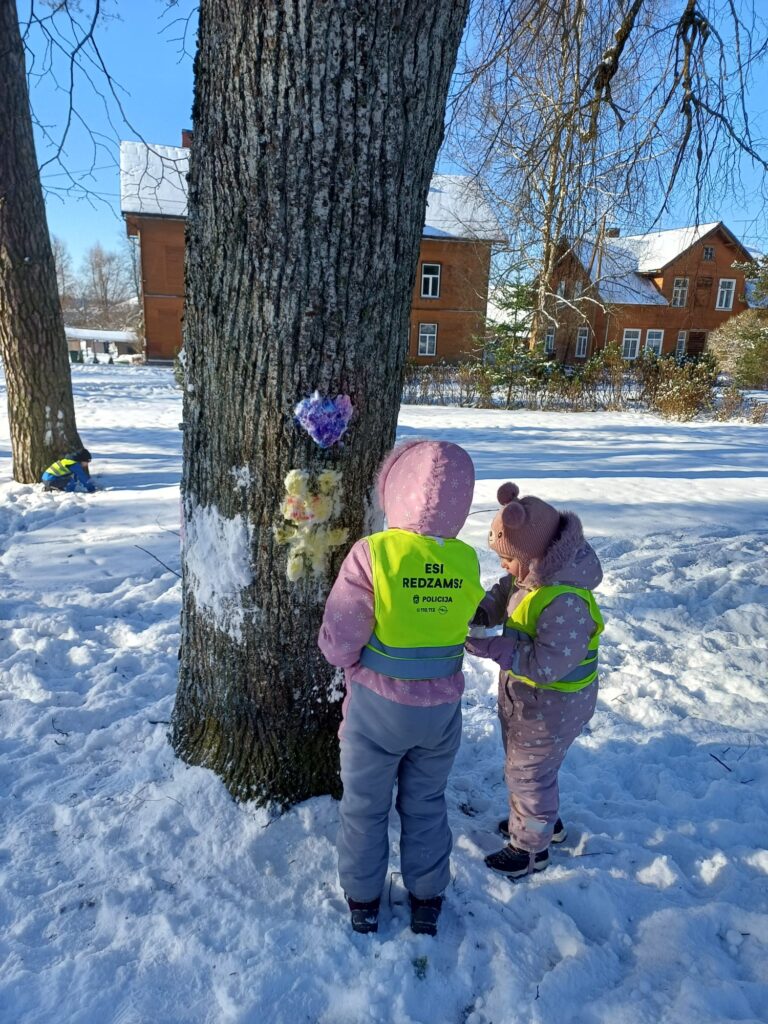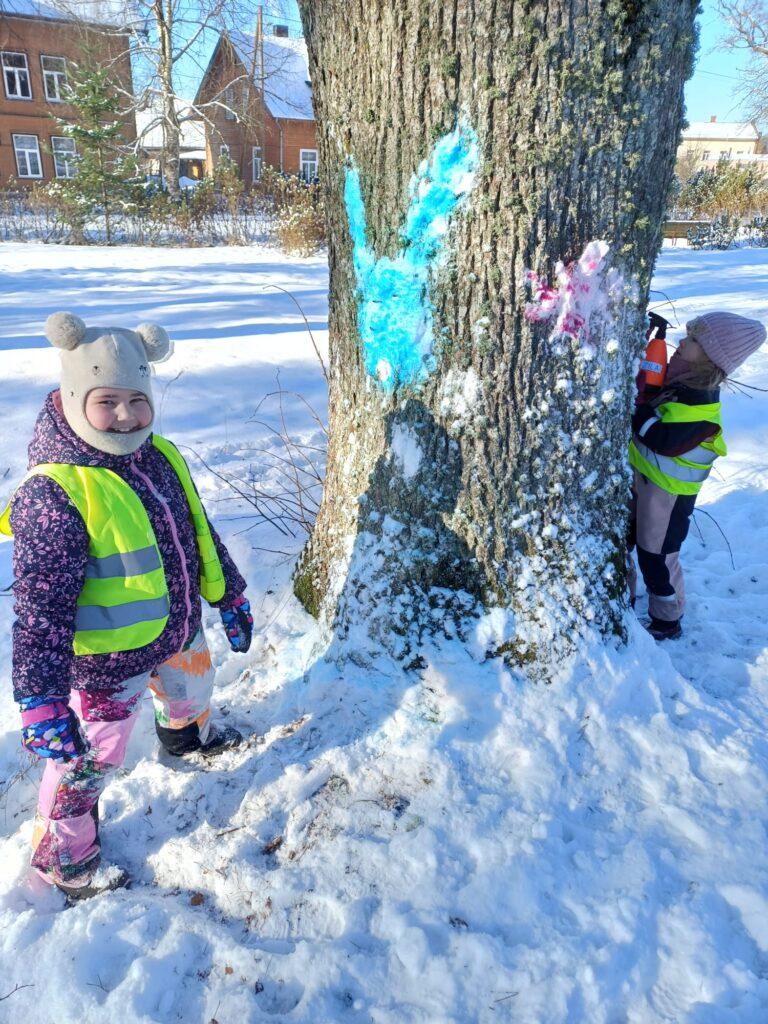 Izrādās, ka zīmēt var arī uz koka stumbriem! Uz stumbra, no sniega, izveidojām dažādus tēlus un pats jautrākais, ka tos varēja apsmidzināt ar pamatkrāsām. Nostiprinājām zināšanas par to, ka sajaucot pamatkrāsas, iegūstam citas krāsas! Un tie skaistie tēli tos koku stumbrus padarīja tik košus…mums patika!