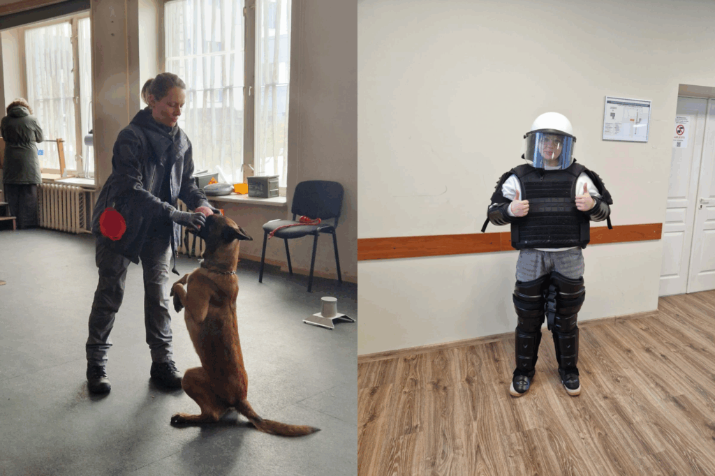 Gaidīta bija tikšanās ar kinoloģijas nodaļas darbiniecēm un viņu uzticamajiem palīgiem – suņiem. Paraugdemonstrējumos tika parādīta gan treniņa nodarbība, gan konkrētas lietas meklēšana. Meitenes minēja, ka nākotnē vēlas apgūt kinologa profesiju. Valsts policijas koledžā ir akreditēta programma kinologa profesijas apguvei.