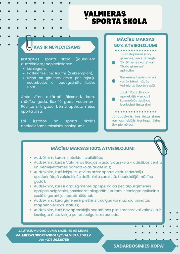 - Vecāku iesniegums (iesnieguma formu var saņemt sporta skolas administrācijā vai pie sporta veida trenera)