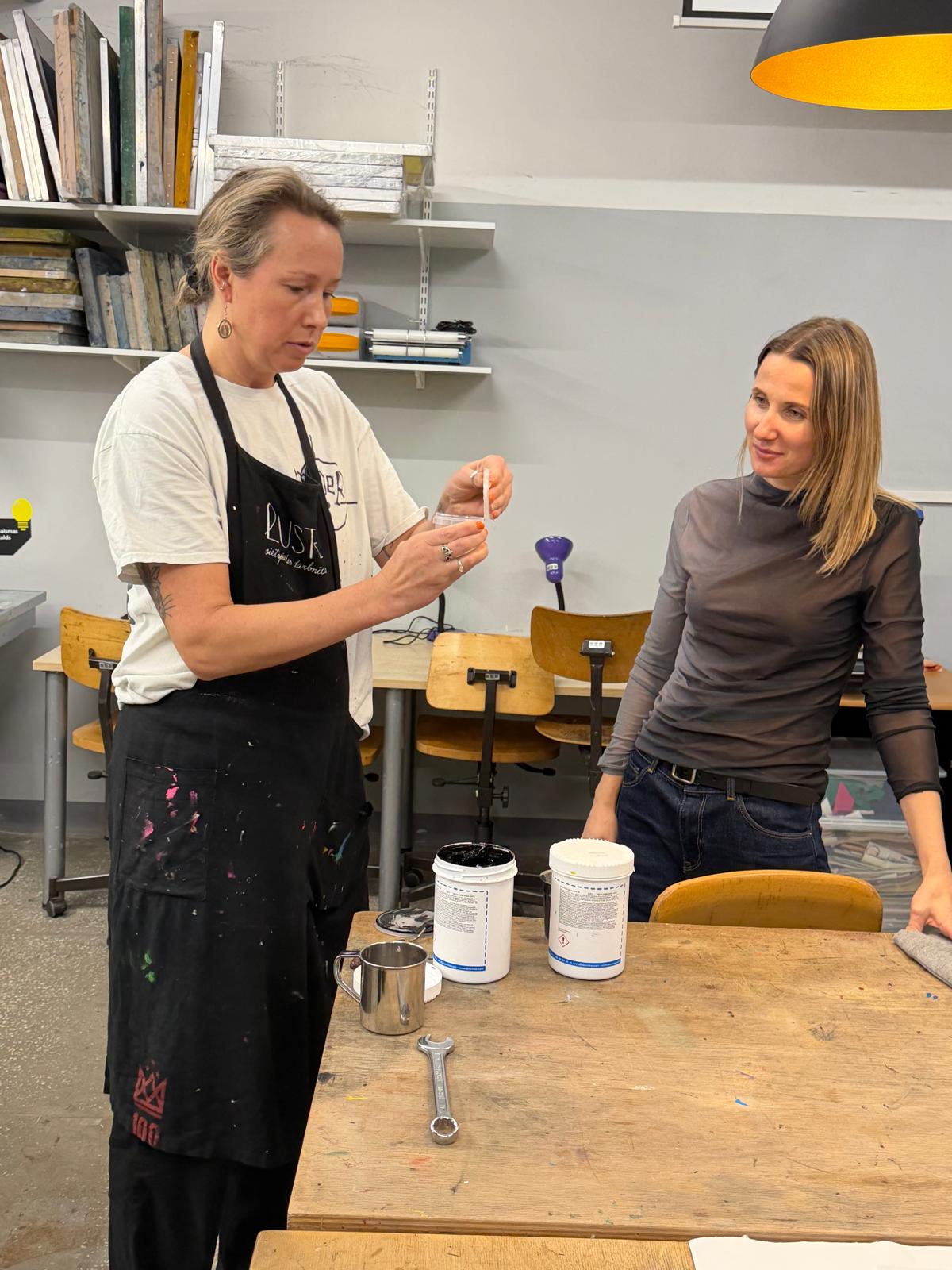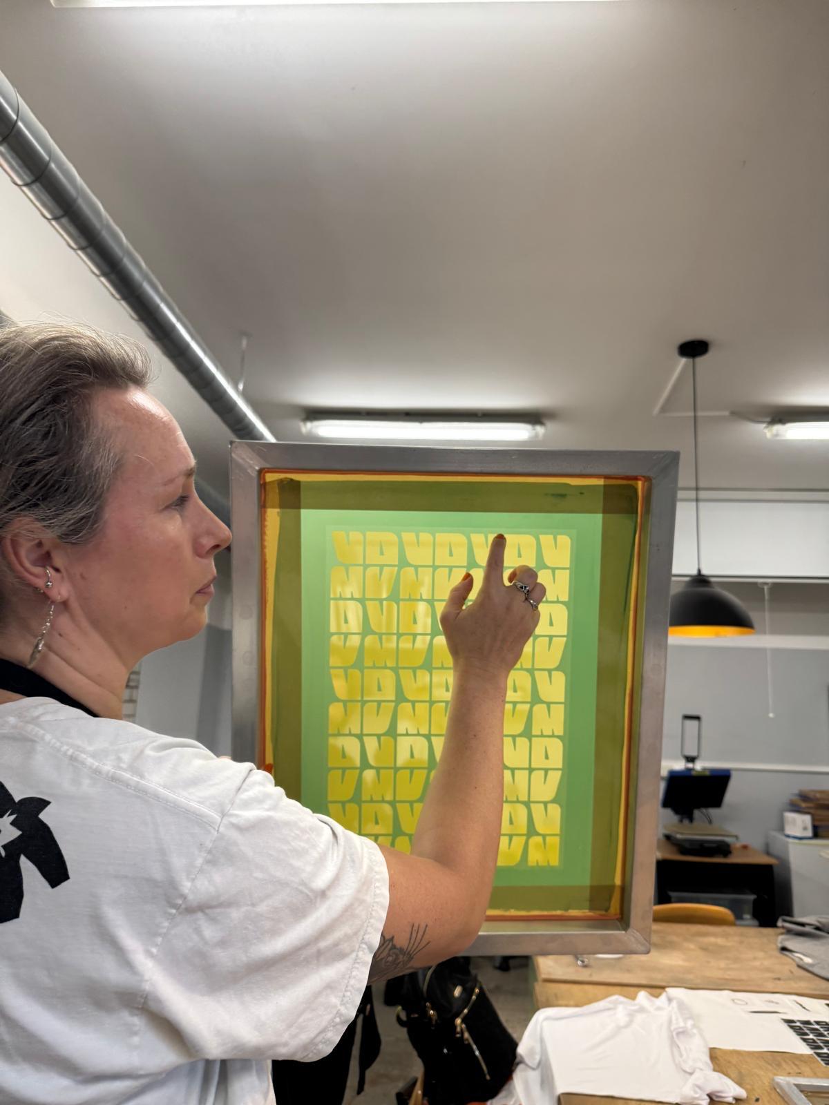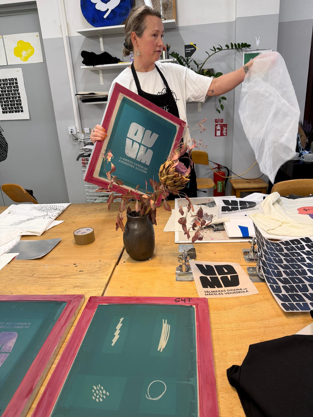 Darbnīcu vadīja Sabīne Vekmane, kura dalībniekus iepazīstināja ar sietspiedes tehnikas praktiskajiem aspektiem, aprīkojuma iespējām un darba vides organizēšanas principiem, kas palīdz panākt kvalitatīvu drukas rezultātu.