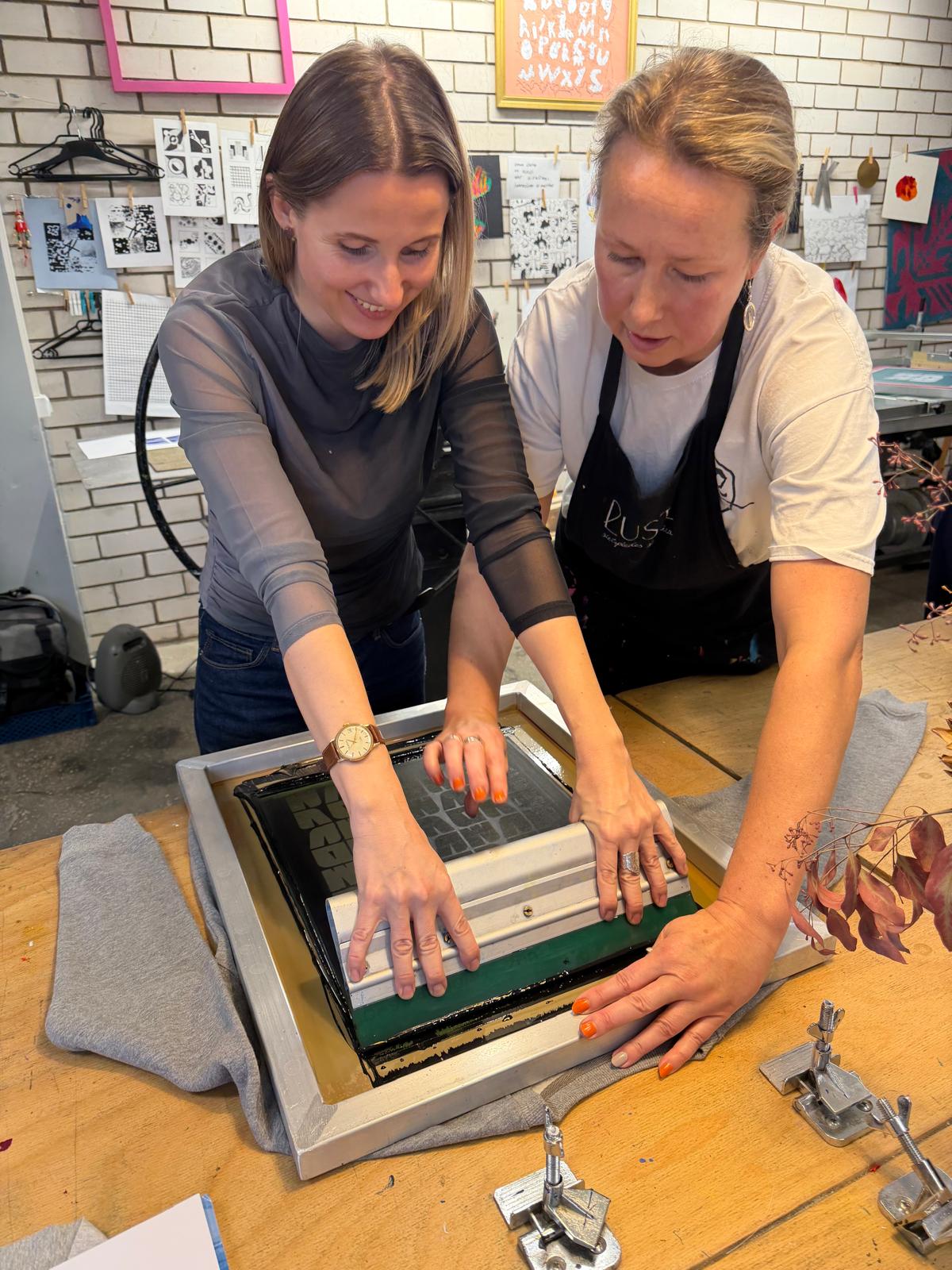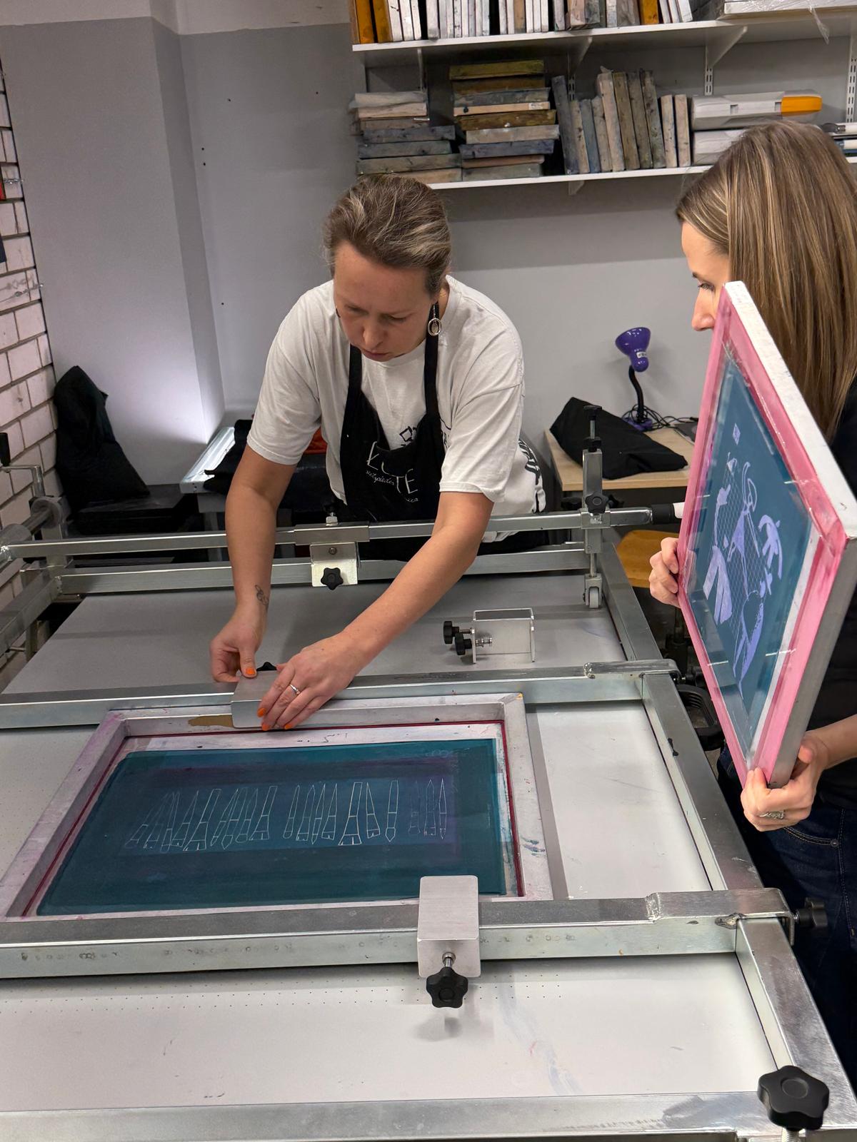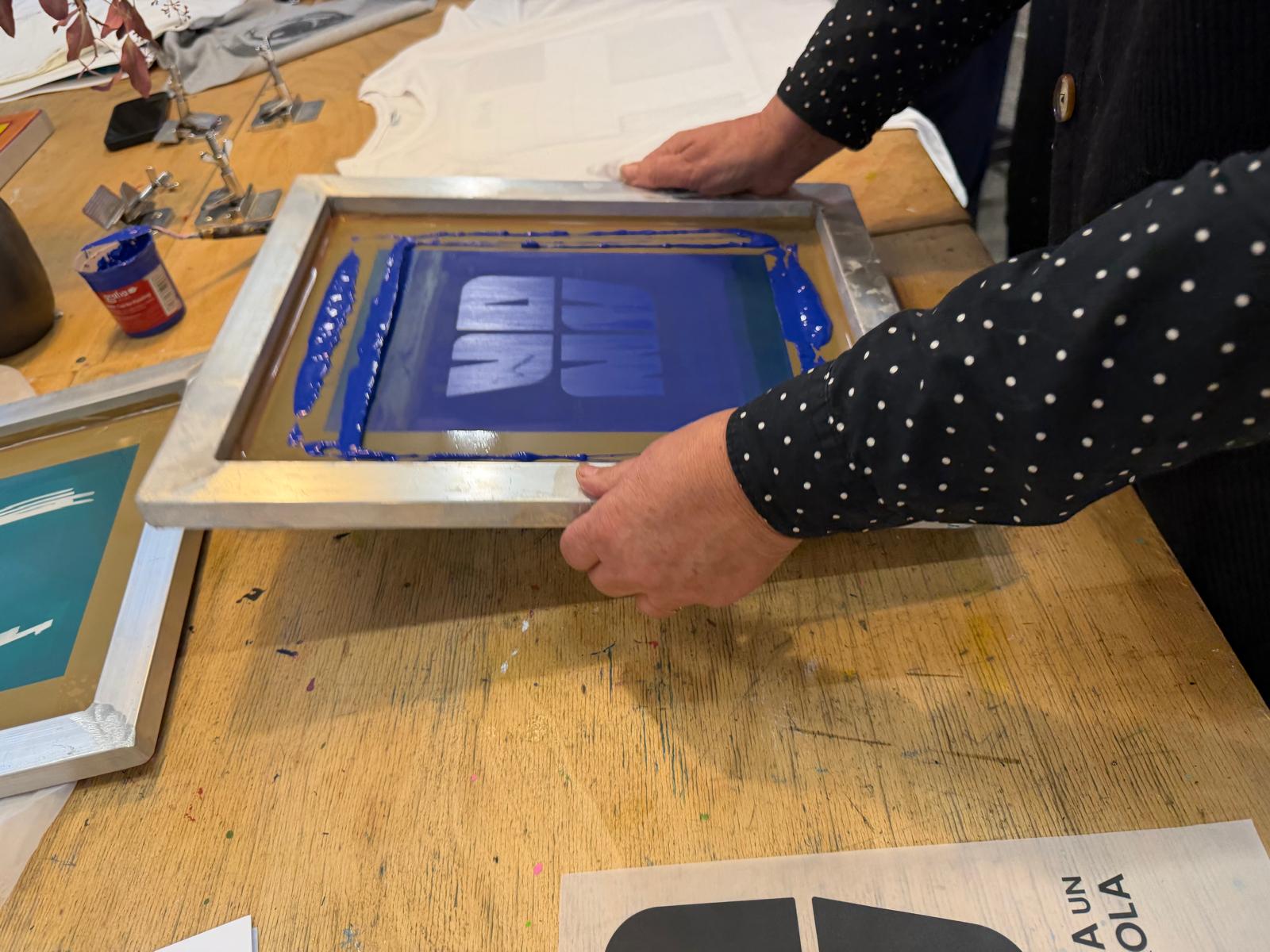 Darbnīcu vadīja Sabīne Vekmane, kura dalībniekus iepazīstināja ar sietspiedes tehnikas praktiskajiem aspektiem, aprīkojuma iespējām un darba vides organizēšanas principiem, kas palīdz panākt kvalitatīvu drukas rezultātu.