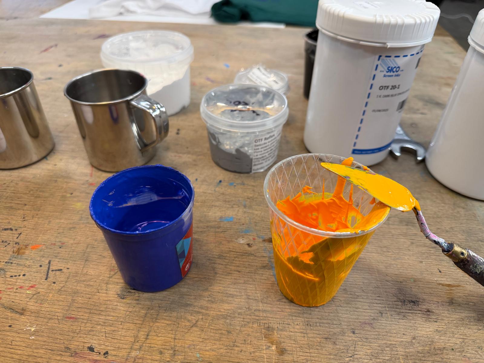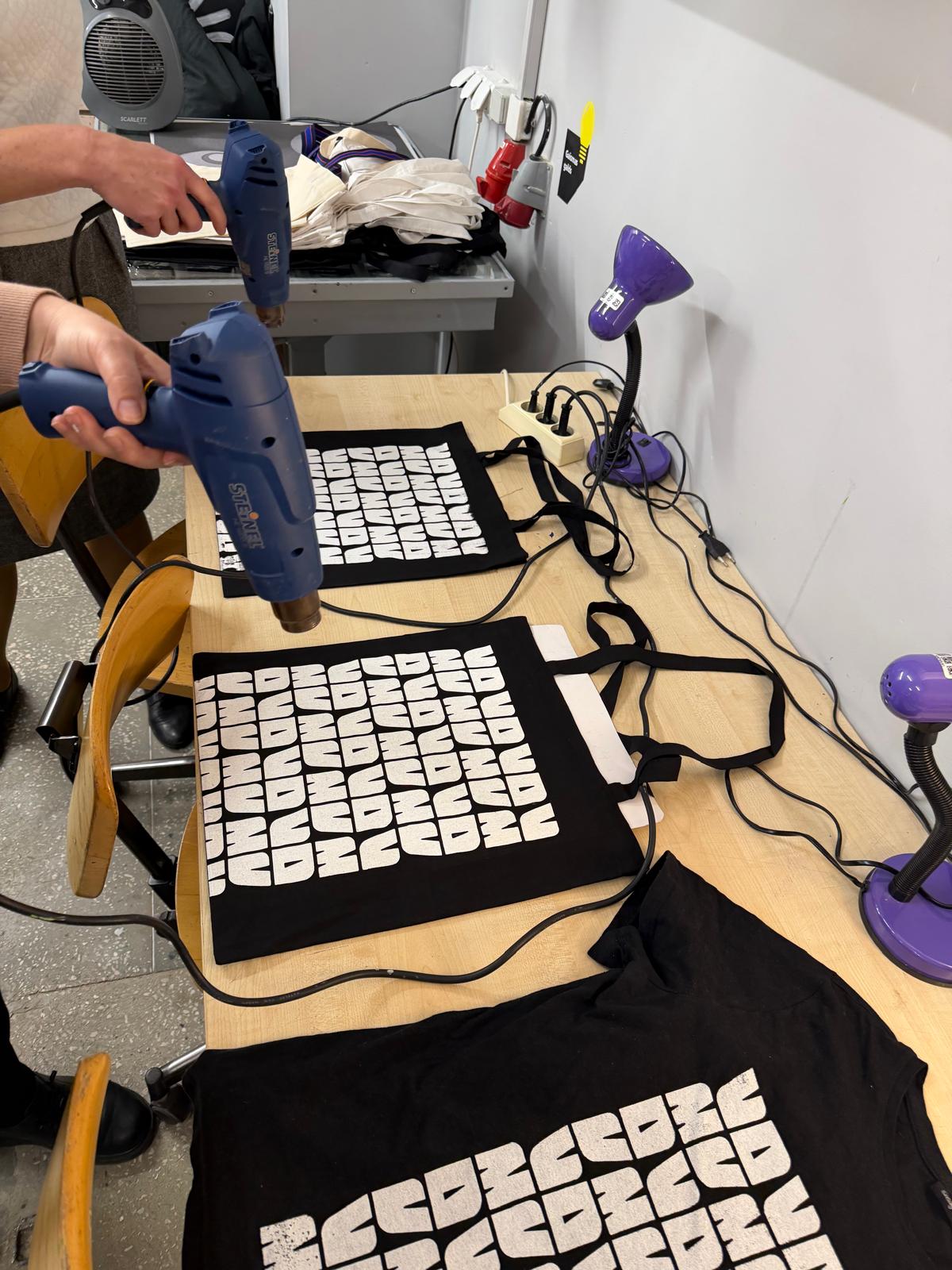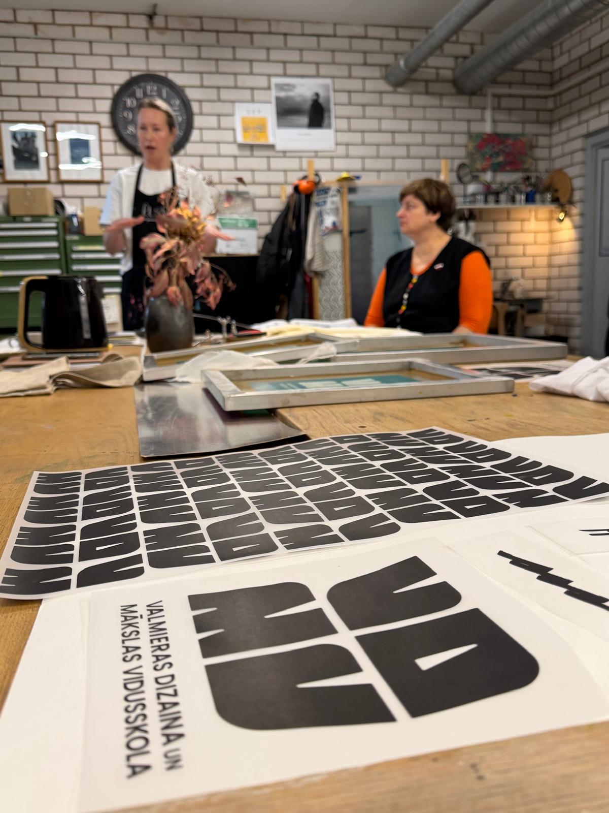 Praktiskajā daļā izmēģinājām dažādus sietspiedes paņēmienus, analizējām drukas rezultātus un testējām apdrukai VDMV jauno logo, kas šobrīd vēl ir izstrādes procesā.