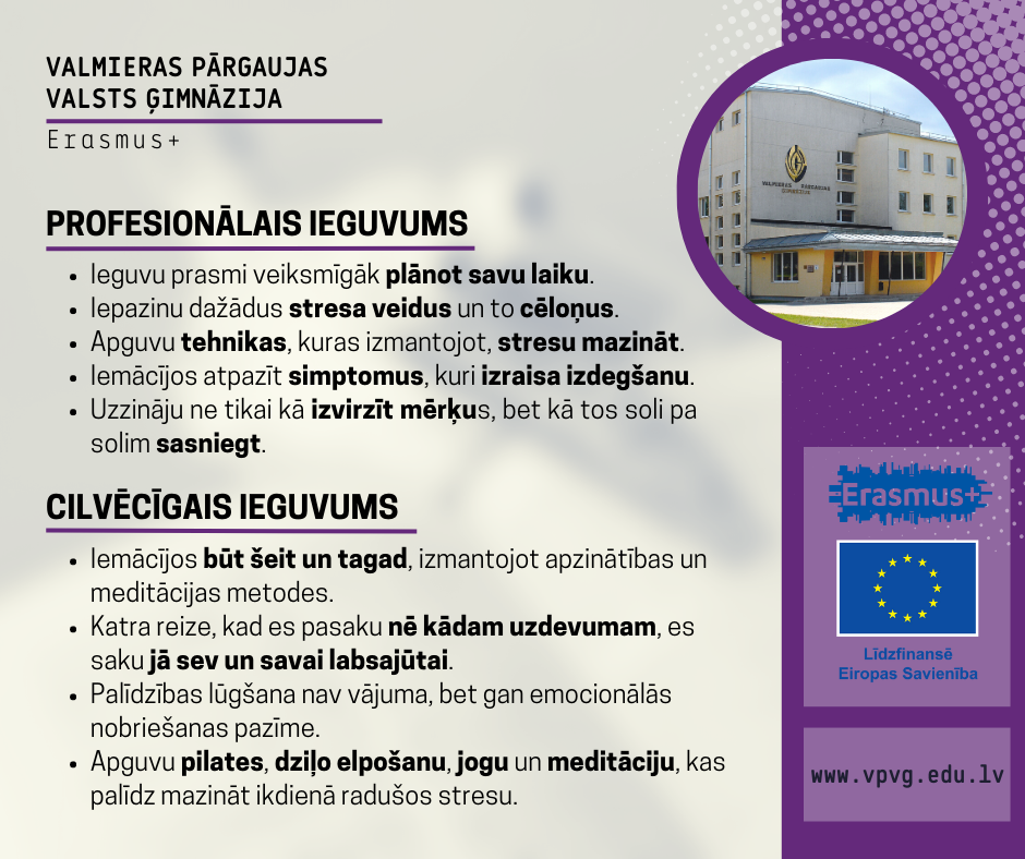 5) Stresa menedžments ar brīvdabas aktivitātēm. Zināšanu iegūšana par to, kas ir stress, kādi stresa tipi ir sastopami, kā reaģēt uz stresu, kādas stresa pārvaldīšanas tehnikas var pielietot, lai pārvaldītu stresu. Teorētiskās zināšanas tiks apvienotas ar praktiskajām iemaņām, piedaloties āra nodarbībās un praktizējot stresa mazināšanas tehnikas.